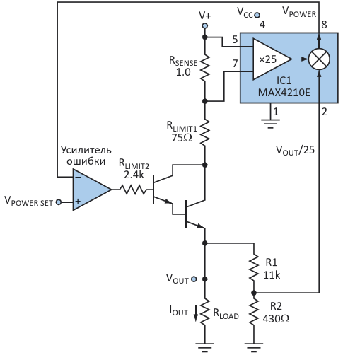 Рисунок 1. Типичная петля обратной связи схемы регулятора напряжения может быть адаптирована для создания стабилизатора мощности нагрузки с изменяющимся сопротивлением