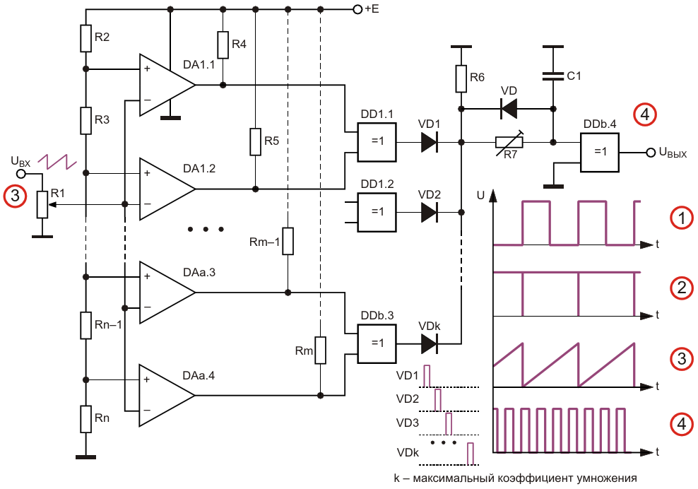 Рисунок 4. Многооконный компаратор и формирователь прямоугольных импульсов, сдвинутых по времени, с суммированием этих импульсов на выходе устройства