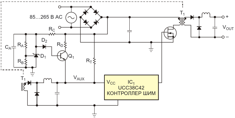 Рисунок 3. В этой усовершенствованной конструкции микросхема ШИМ контроллера IC1 получает питание от резистора RT при запуске, от вспомогательной обмотки при нормальной работе и от схемы параллельного регулятора IC2 и транзистора Q