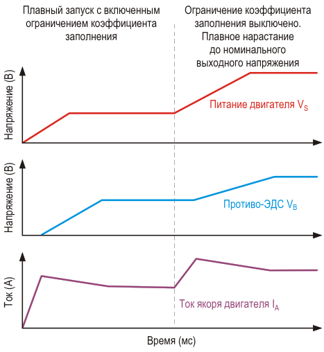 Запуск с ограничением коэффициента заполнения обеспечивает небольшое начальное напряжение