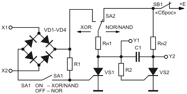 Универсальный двухтиристорный логический элемент NOR/XOR/NAND (выход Y1), OR/XNOR/AND (выход Y2)