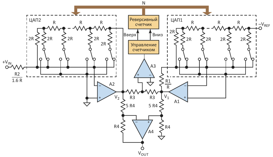В примере схемы для наглядности и простоты используется только четыре переключателя в каждом ЦАП, но количество переключателей можно увеличить для повышения точности