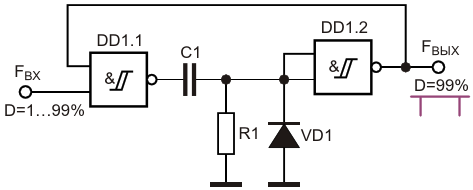 Рисунок 4. Формирователь импульсов с КЗИ порядка 99% из входных импульсов с произвольным КЗИ