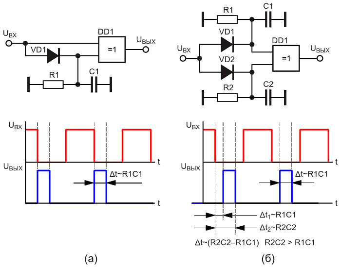 Схемы формирователей на элементах «Исключающее ИЛИ» и RC-цепочках параллельного включения: (а) короткого импульса и (б) задержки импульса после окончания импульса входного