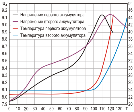 Рисунок 1. Диаграммы напряжения и температуры аккумуляторов в процессе заряда. Шкала по горизонтальной оси в минутах