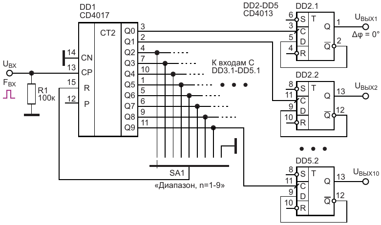 Рисунок 2. Многодиапазонный фазовращатель с параллельными независимыми выходами сдвига фаз