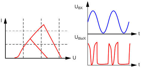 Рисунок 2. Обобщенная ВАХ негаваристоров, приведенных на Рисунке 1, а также вид исходного и искажённого сигналов на входе и выходе негаваристора