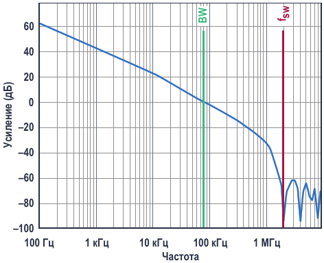 Рисунок 2. Диаграмма Боде, показывающая амплитудно-частотную характеристику контура управления с точкой перехода 0 дБ на частоте приблизительно 80 кГц