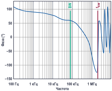 Рисунок 2. Диаграмма Боде, показывающая амплитудно-частотную характеристику контура управления с точкой перехода 0 дБ на частоте приблизительно 80 кГц