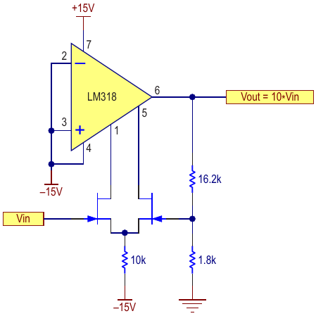 Моя любимая конструкторская идея, нарисованная по памяти. Умная идея использования всех внутренних выходных каскадов LM318 вместе с выбираемым пользователем входным каскадом оказалась универсальной и привлекательной для меня и других, и в последующие годы