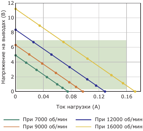 Зависимость напряжения на выводах от тока нагрузки для высокоэффективного бесщеточного двигателя постоянного тока 16C18
