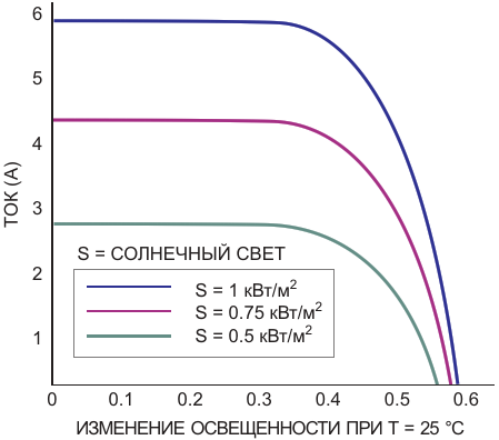 Рисунок 1. Выходной ток солнечного элемента падает с уменьшением количества солнечного света