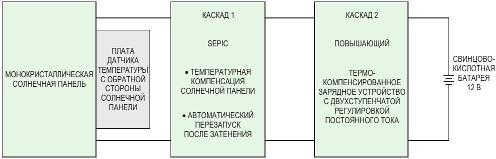 Рисунок 3. В зарядном устройстве в качестве входного источника используется 18-элементная 3-ваттная солнечная панель. Система состоит из двух каскадов, первый из которых контролирует напряжение солнечной панели и вырабатывает напряжение, которое отслеживает изменени