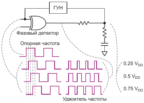Элемент «исключающее ИЛИ», генератор, управляемый напряжением, и несколько пассивных компонентов образуют удвоитель частоты