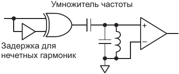 Рисунок 3. Умножитель частоты сделан на логическом элементе «исключающее ИЛИ», операционном усилителе, двух конденсаторах, индуктивности и элементе задержки