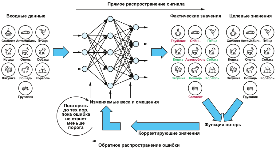 Рисунок 2. Цикл обучения, состоящий из прямого и обратного распространения