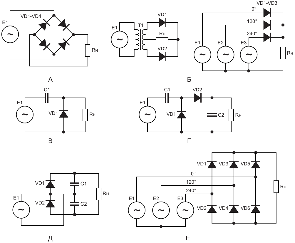 Классические схемы выпрямителей: А - Мостовой выпрямитель переменного тока К.Ф. Поллака (1895), Л. Гретца (1897) Б - Однофазный двухполупериодный и трёхфазный однополупериодный выпрямитель В.Ф. Миткевича (1901) В - Однополупериодный выпрямитель П.У. Вилла