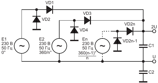Рисунок 10. Многофазный выпрямитель на основе последовательного включения диодно-емкостных выпрямителей