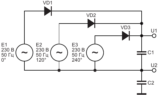 Рисунок 5. Трехфазный выпрямитель (упрощенный вариант) с двумя выходными напряжениями