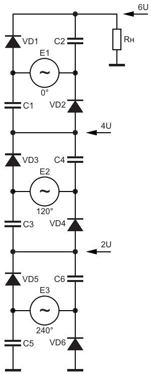 Рисунок 10. Многофазный выпрямитель на основе последовательного включения диодно-емкостных выпрямителей