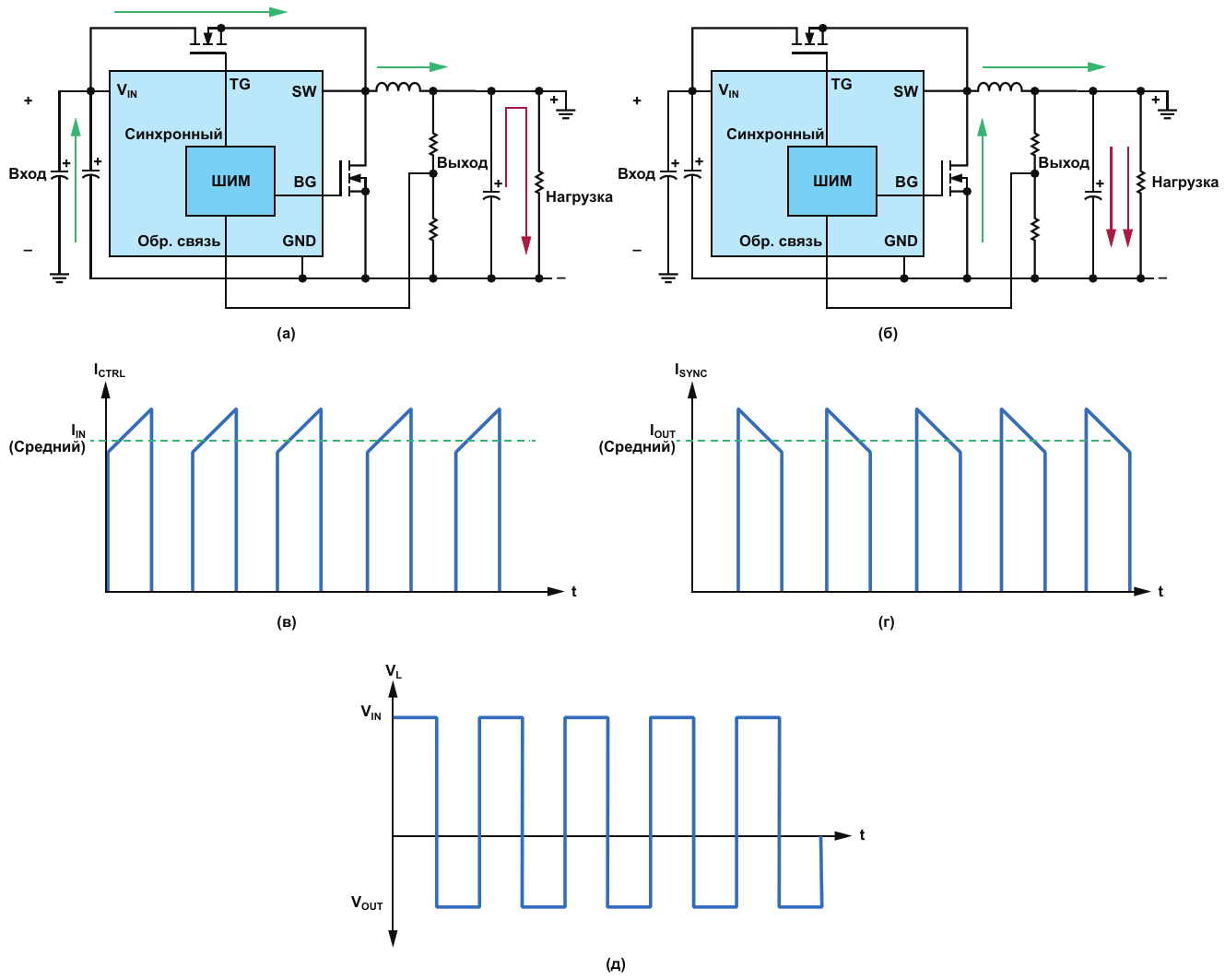 (а) - Ток во время включения, (б) - ток во время выключения, (в) - ток через верхний управляющий MOSFET (ICTR), (г) - ток через нижний MOSFET синхронного выпрямителя (ISYNC) и (д) - напряжение на дросселе