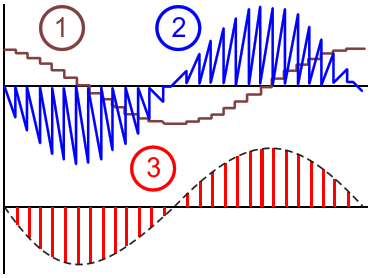Осциллограммы напряжения: 1 - на обкладках конденсатора C1; 2 - в точке соединения конденсатора C1 и измерителя тока PA1; 3 - на резисторе R2 (пунктир - огибающая кривая)