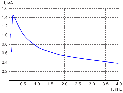 Зависимость тока в цепи коммутатора от частоты коммутации при коэффициенте заполнения импульсов 12%. Локальный минимум отмечается на частоте 100 Гц