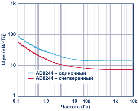 Характеристика буфера AD8244: шум составляет половину от шума нормального буфера