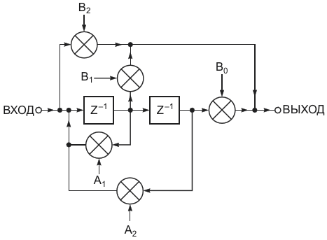 Рисунок 1. Передаточная функция рекурсивного цифрового фильтра второго порядка содержит значения коэффициентов, которых соответствуют характеристикам фильтров нижних частот, верхних частот, режекторных или полосовых