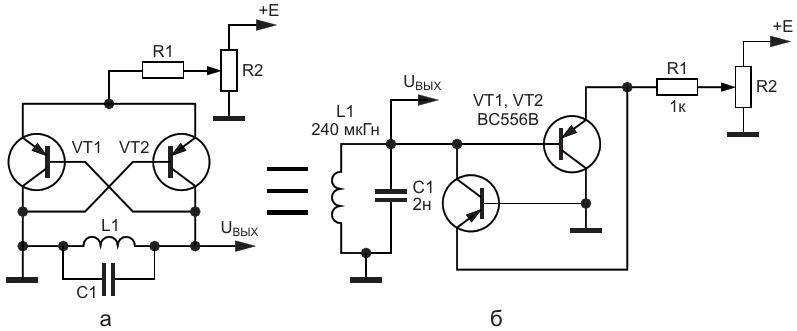 Типовая схема LC-генератора с эмиттерной связью в различных вариантах графического представления