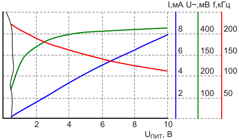 Рисунок 4. Зависимость свойств LC-генератора с эмиттерной связью, Рисунок 3 от напряжения питания