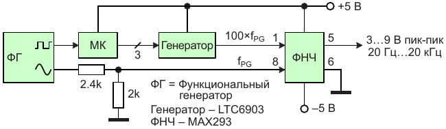 Умножитель частоты и следящий фильтр нижних частот снижают THD синусоидального сигнала, поступающего от функционального генератора, на 78 дБ и более