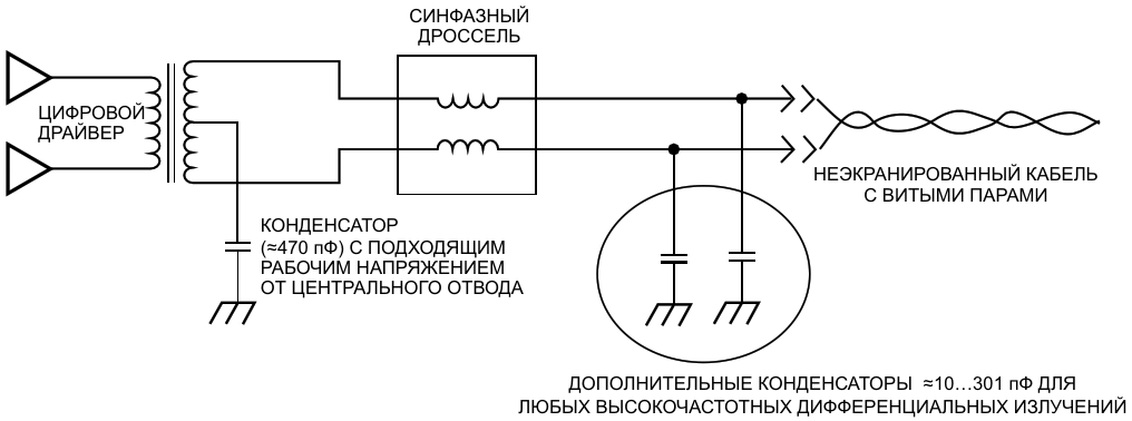 Конденсатор, подключенный между центральным отводом трансформатора и землей, обеспечивает захват синфазных токов и снижает радиочастотные излучения. Синфазный дроссель, дополняющий эту схему захвата, делает подавление синфазных помех практически полным.ни