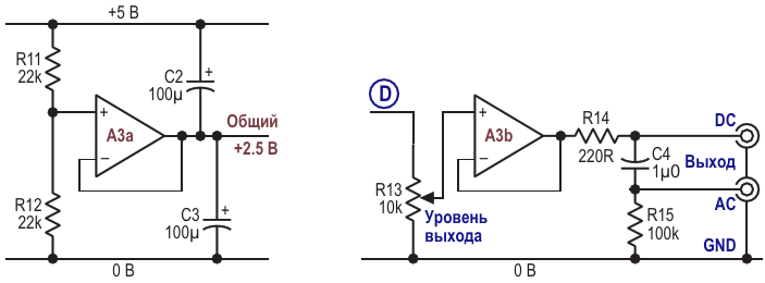 Рисунок 4. Простая схема для получения «общей» виртуальной земли 2.5 В, а также регулятор выходного уровня и буфер с выходами как для постоянной, так и для переменной составляющих сигнала