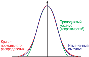 Рисунок 3. Сравнение идеальной кривой нормального распределения и приподнятого косинуса - выходного сигнала схемы на Рисунке 1
