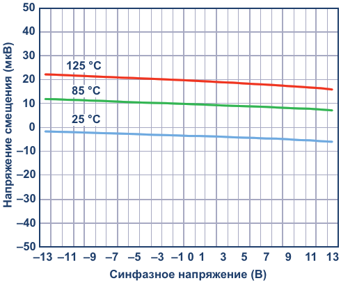 Рисунок 2. Зависимость входного напряжения смещения от входного напряжения для микросхемы ADA4077