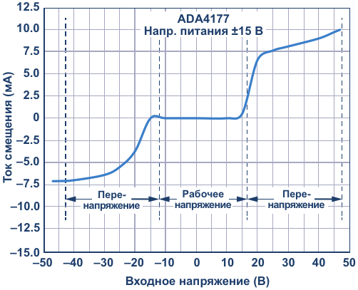 Входной ток смещения ADA4177 ограничивается по мере увеличения перенапряжения