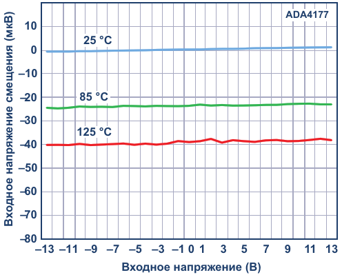 Рисунок 2. Зависимость входного напряжения смещения от входного напряжения для микросхемы ADA4077