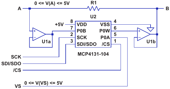 Рисунок 1. Простой программируемый реостат, в котором используется тот же цифровой потенциометр, что и в других решениях