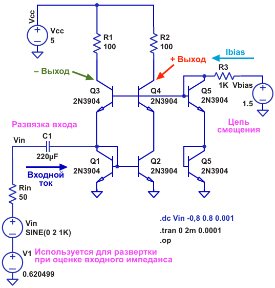 Созданная в LTspice схема топологии микромесителя с 6 биполярными транзисторами, включенными таким образом, что выходные токи транзисторов Q3 и Q4 зависит от полярности входного сигнала