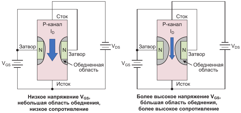 Рисунок 5. Характеристики p-канального JFET, на которых выделены области омического сопротивления и насыщения
