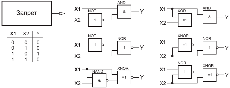 Рисунок 1. Логические элементы «Запрет» и их таблица истинности