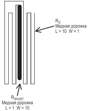 Рисунок 2. Вот как выглядит общий чертеж предполагаемых дорожек токоизмерительного резистора и резистора, определяющего усиление