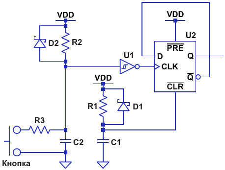 U1 - это инвертор с триггером Шмитта, а U2 - D-триггер. Диоды - малосигнальные диоды Шоттки. Нормальное состояние кнопки разомкнутое. Номиналы резисторов и конденсаторов обсуждаются в тексте