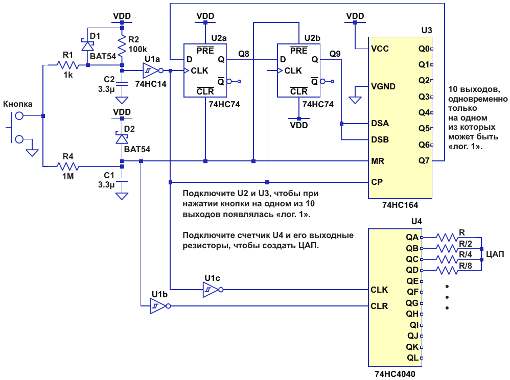Рисунок 1. U1 - это инвертор с триггером Шмитта, а U2 - D-триггер. Диоды - малосигнальные диоды Шоттки. Нормальное состояние кнопки разомкнутое. Номиналы резисторов и конденсаторов обсуждаются в тексте