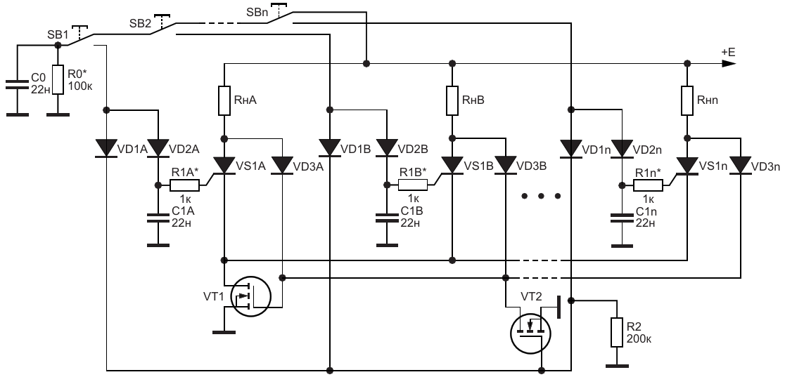 Электрическая схема тиристорного аналога кнопочного переключателя с зависимой фиксацией