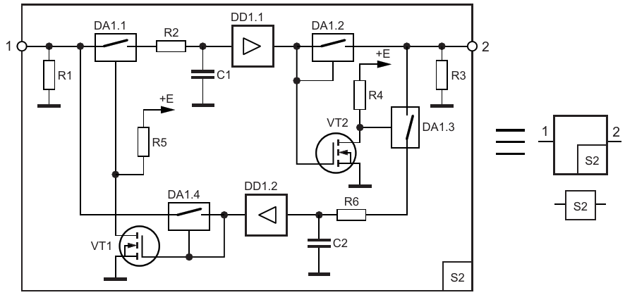 Рисунок 3. Единичный электрический узел реверсивной модели солитона (реверсивный повторитель напряжения)
