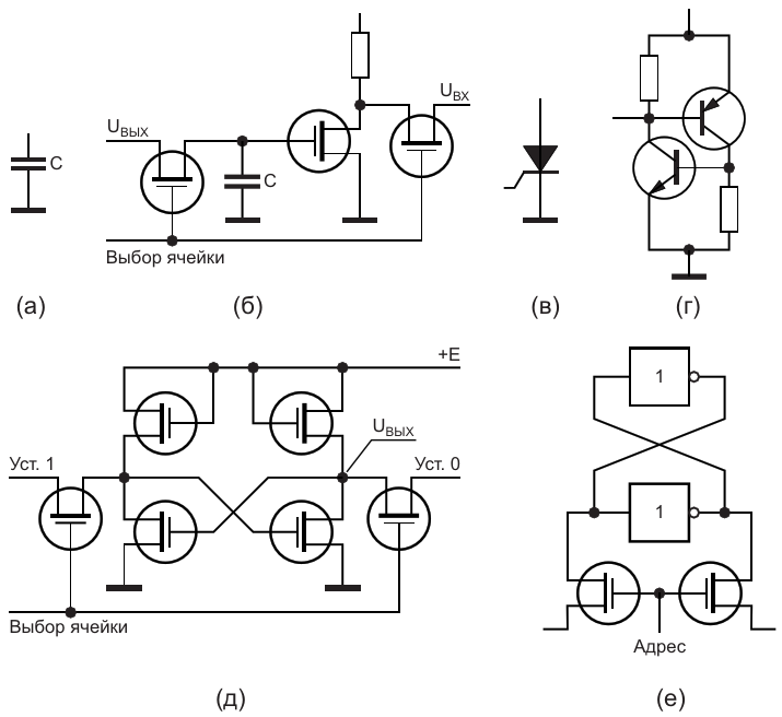 Классические единичные элементы памяти: (а) конденсаторные; (б) конденсаторные со схемой управления; (в) псевдотиристорные; (г) на основе транзисторных аналогов тиристора; (д) на основе транзисторных RS-триггеров и (е) RS-триггеров на элементах NOT