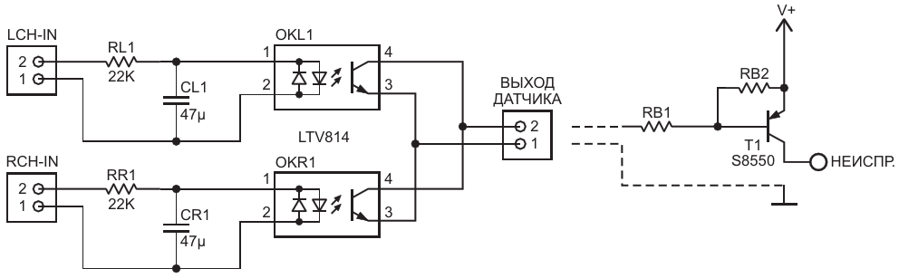 Аналоговый входной каскад предназначен для обнаружения постоянного смещения в звуковом сигнале и защиты динамиков