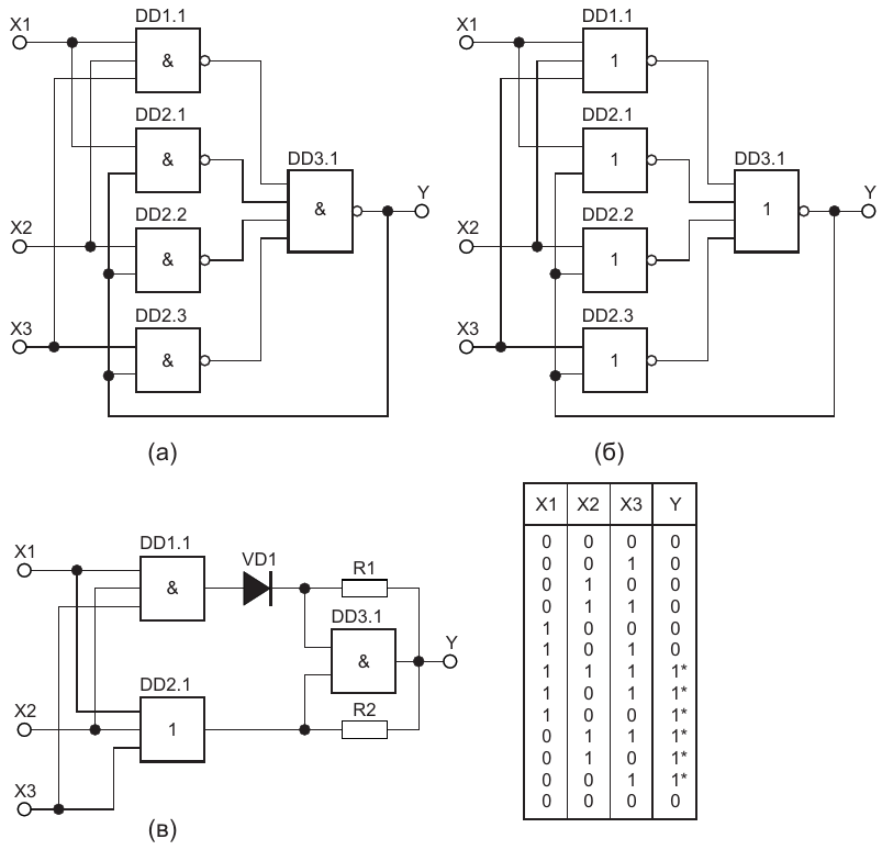 Трехвходовые логические элементы с памятью состояния на основе элементов: а) и б) NAND и NOR, соответственно; в) AND и OR, а также их таблица истинности